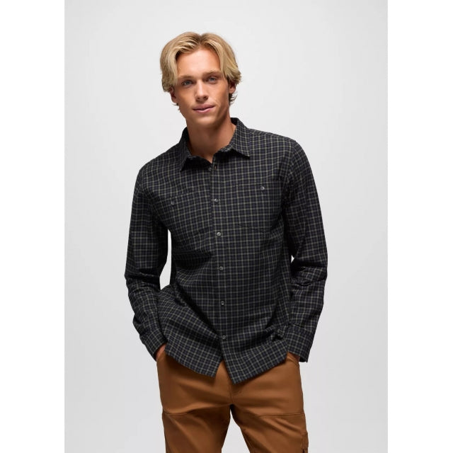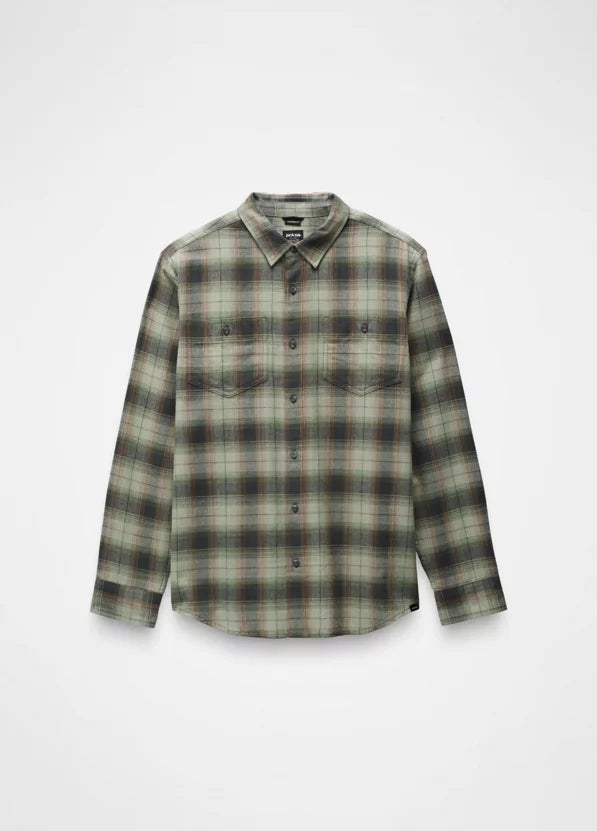 Organic cotton yarn dye plaid woven flannel • Double chest patch pockets with button closure • Self lined interior yoke • Internal security pocket • Faux corozo buttons • Exterior prAna woven label at bottom front hem