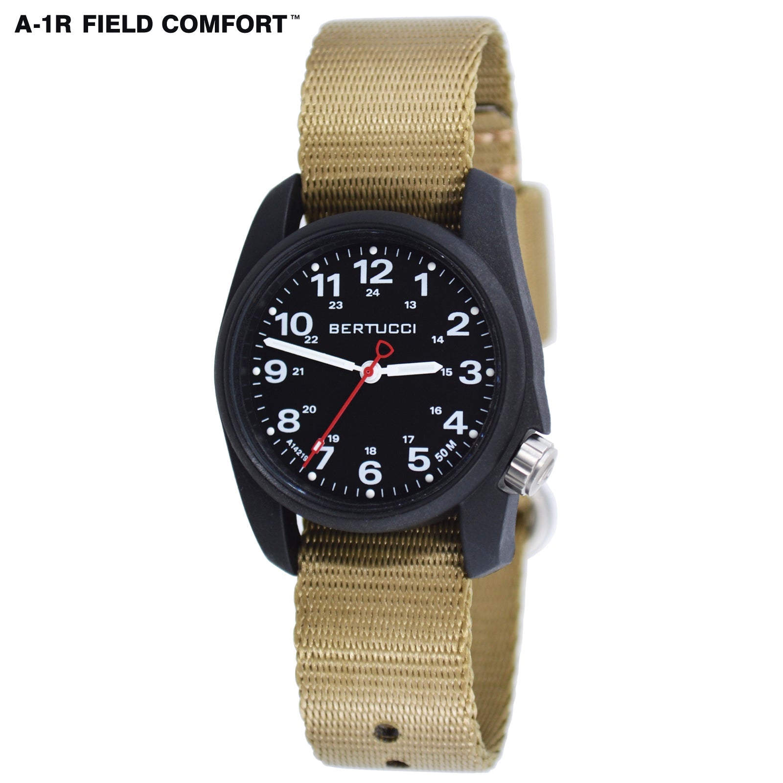The A-1R Field Comfort™ was developed for light weight comfort in a traditionally sized 36 mm case... weighing an amazing 1.16 oz. / 33 grams. The core of the design is our rugged U.S. Patented fiber reinforced Unibody™ case and our ultra-smooth Comfort-Webb™ band. Additionally, a 3 year battery, ergonomic off set crown, 50 M water resistance, scratch resistance R-Type mineral crystal, and precision movement. A watch that will last, and one that you won’t even know you’re wearing.