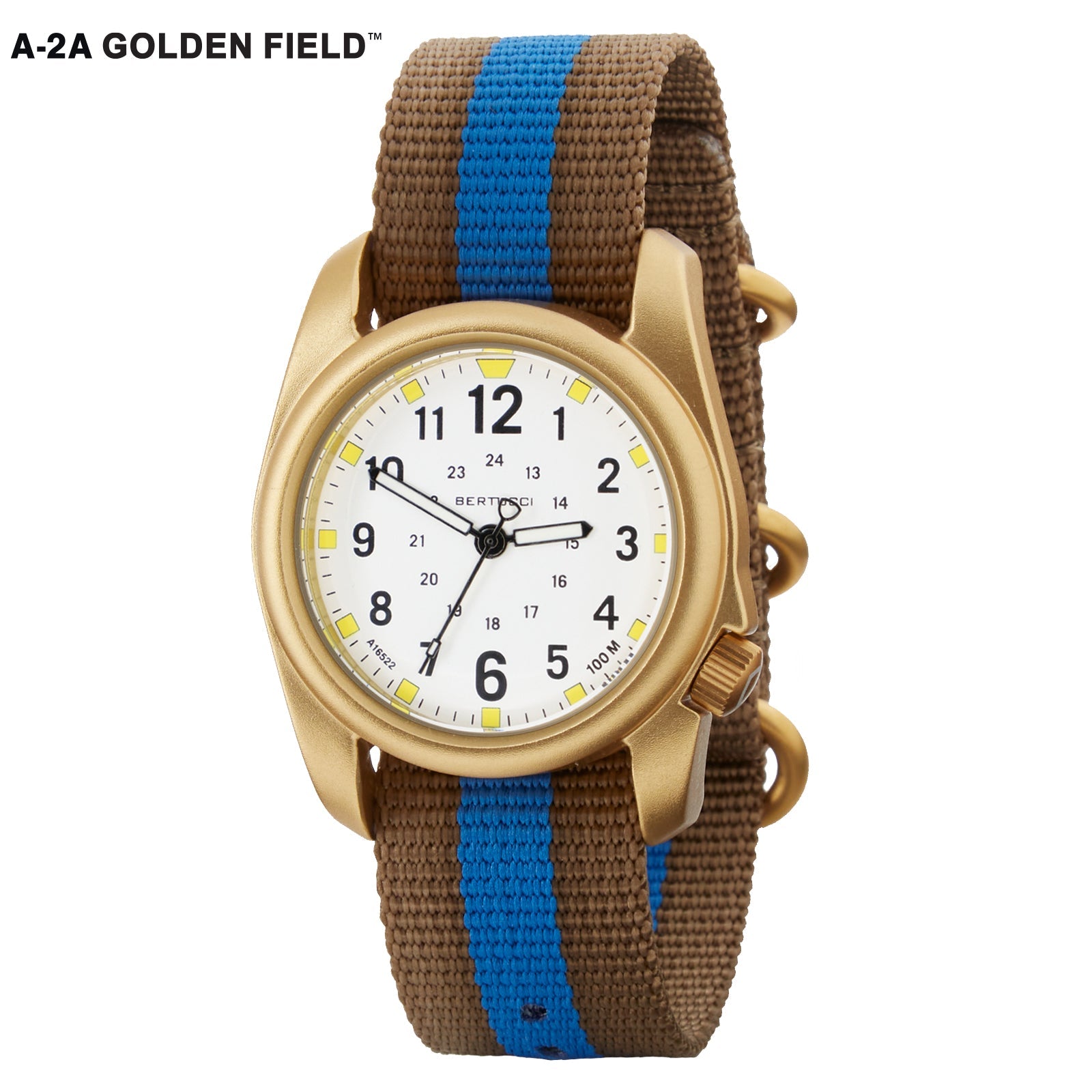 The A-2A Golden Field™ innovative design brings together durability and comfort in a dress look. It features our legendary A-2 U.S. Patented Unibody™ 40 mm case in non-reflective anodized gold tone aluminum. The versatile Golden Field™ requisite field ready features include: Easy to read functional dial w/ 12/24 hour markings, 100M water resistant, rugged B-Type Gold Line™ Nylon band, 4 year battery, accurate & long lasting gold plated all-metal movement, Swiss super luminous hands & markers, and scratch resistant R-Type mineral glass crystal.